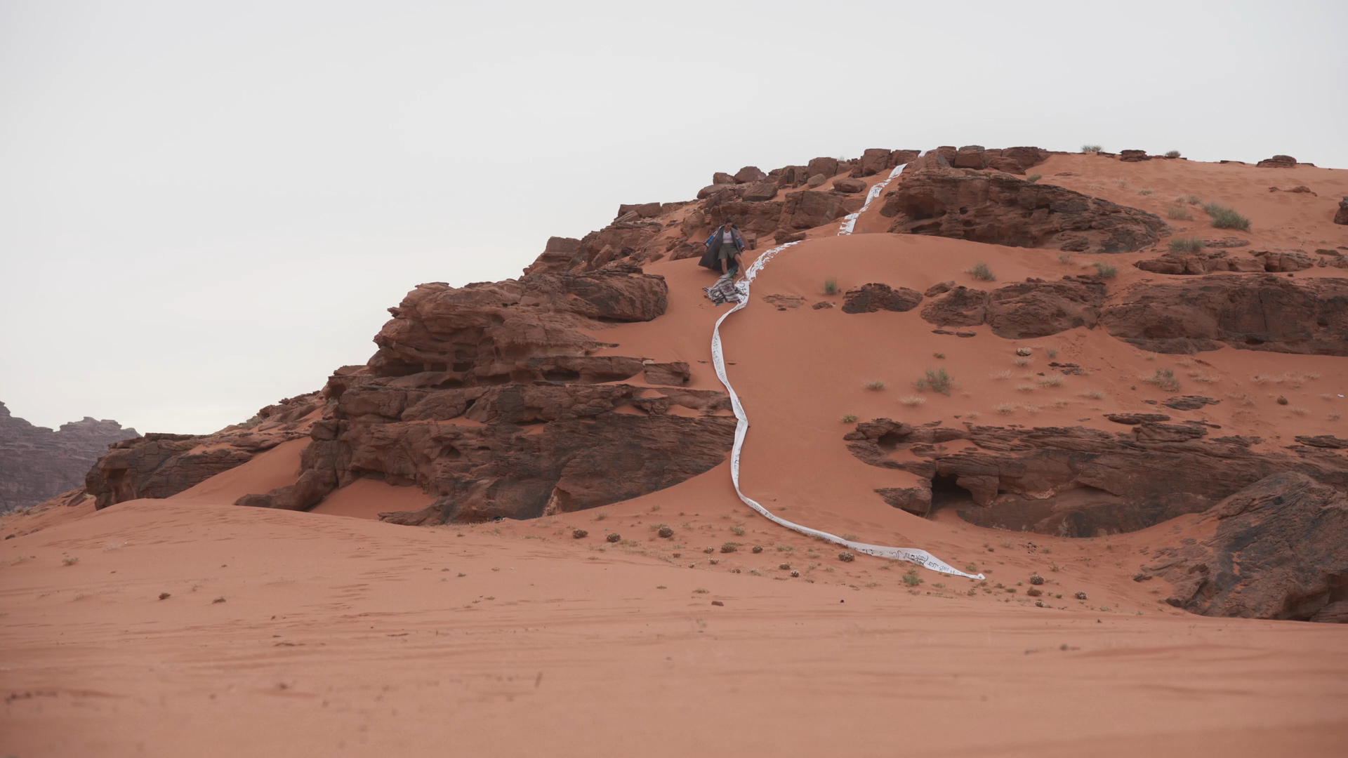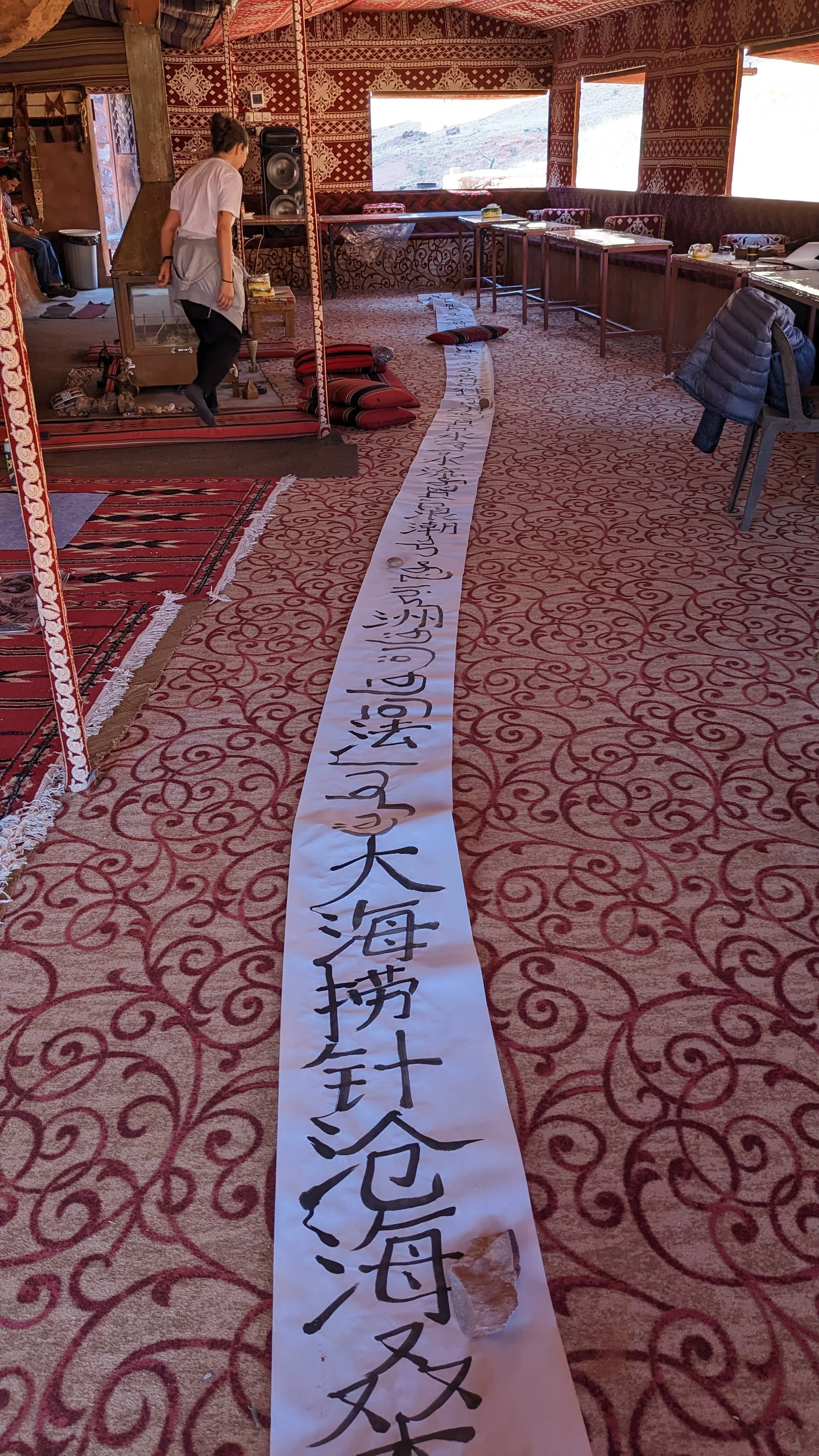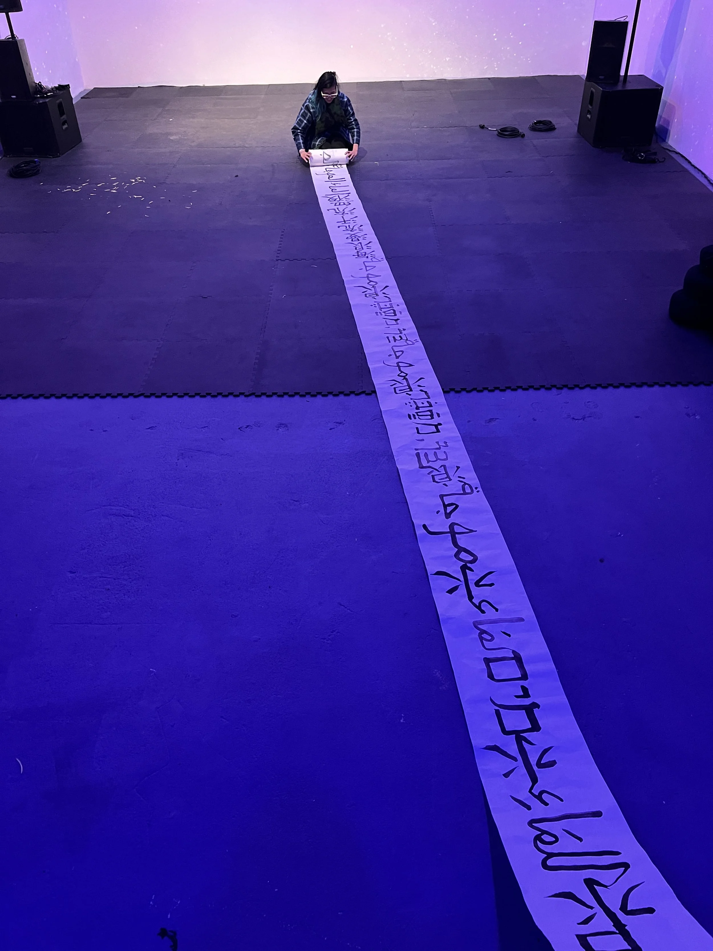 The first performance was initiated during One of Many’s Residency in Jordan in 2023, leverages the power of calligraphy to explore the themes of water's symbolism, language, identity, and environment. Through creating a 160-foot scroll in Chinese, Hebrew, and Arabic, I staged a performance in the Wadi Rum desert. This scroll, containing water-themed words, was ceremonially unraveled down a dune in Jordan to symbolize a 'scroll river’. This metaphorical river flowing through the desert explores how water transcends borders, connecting disparate lands and peoples.