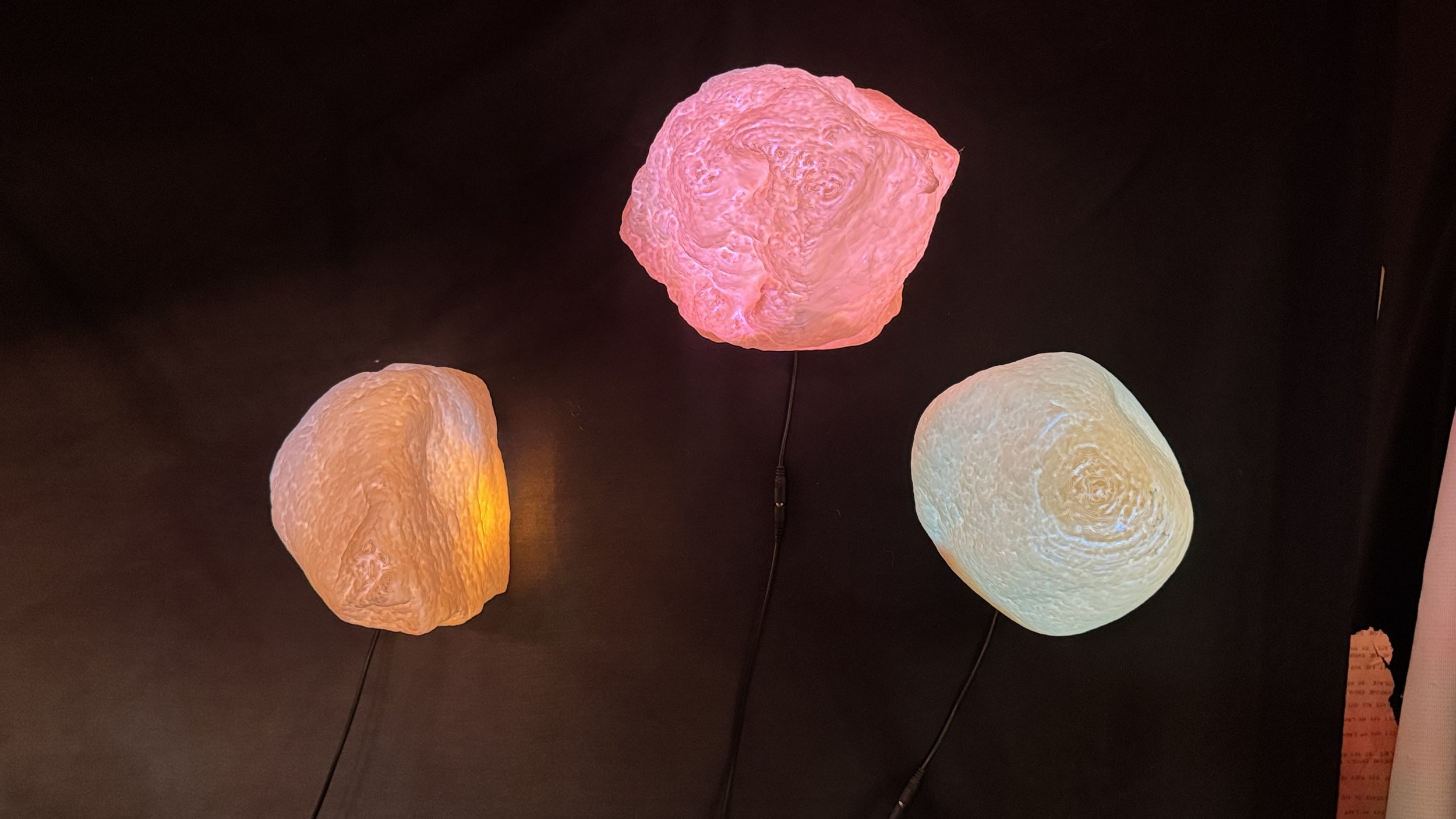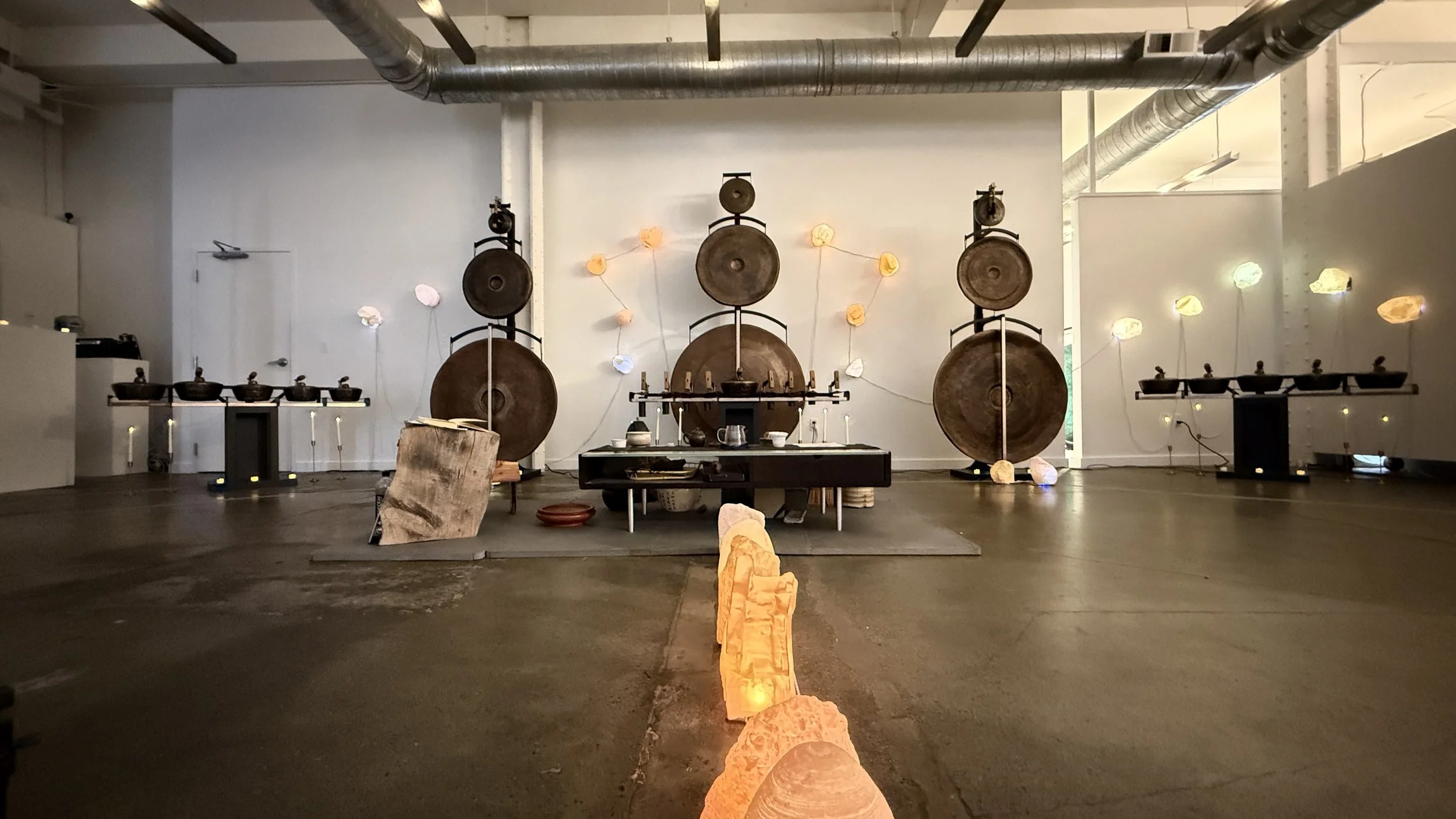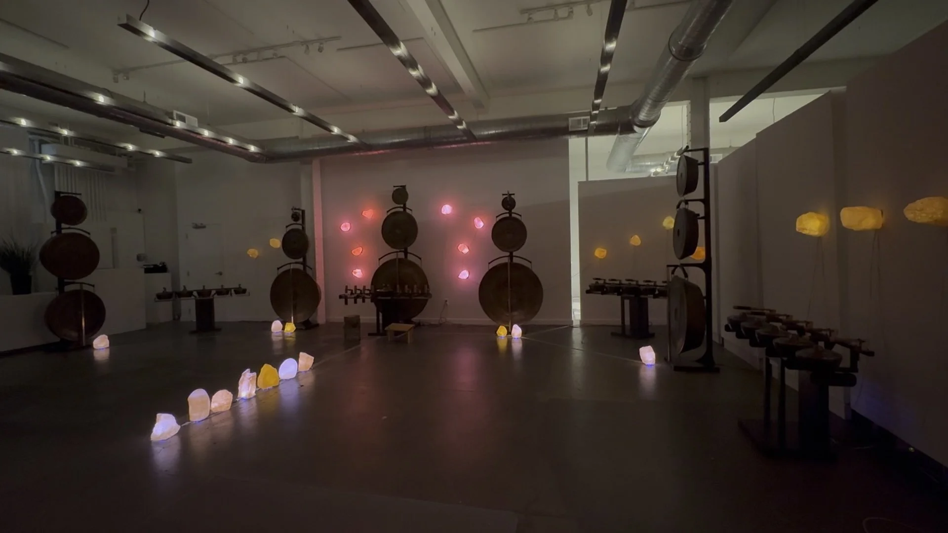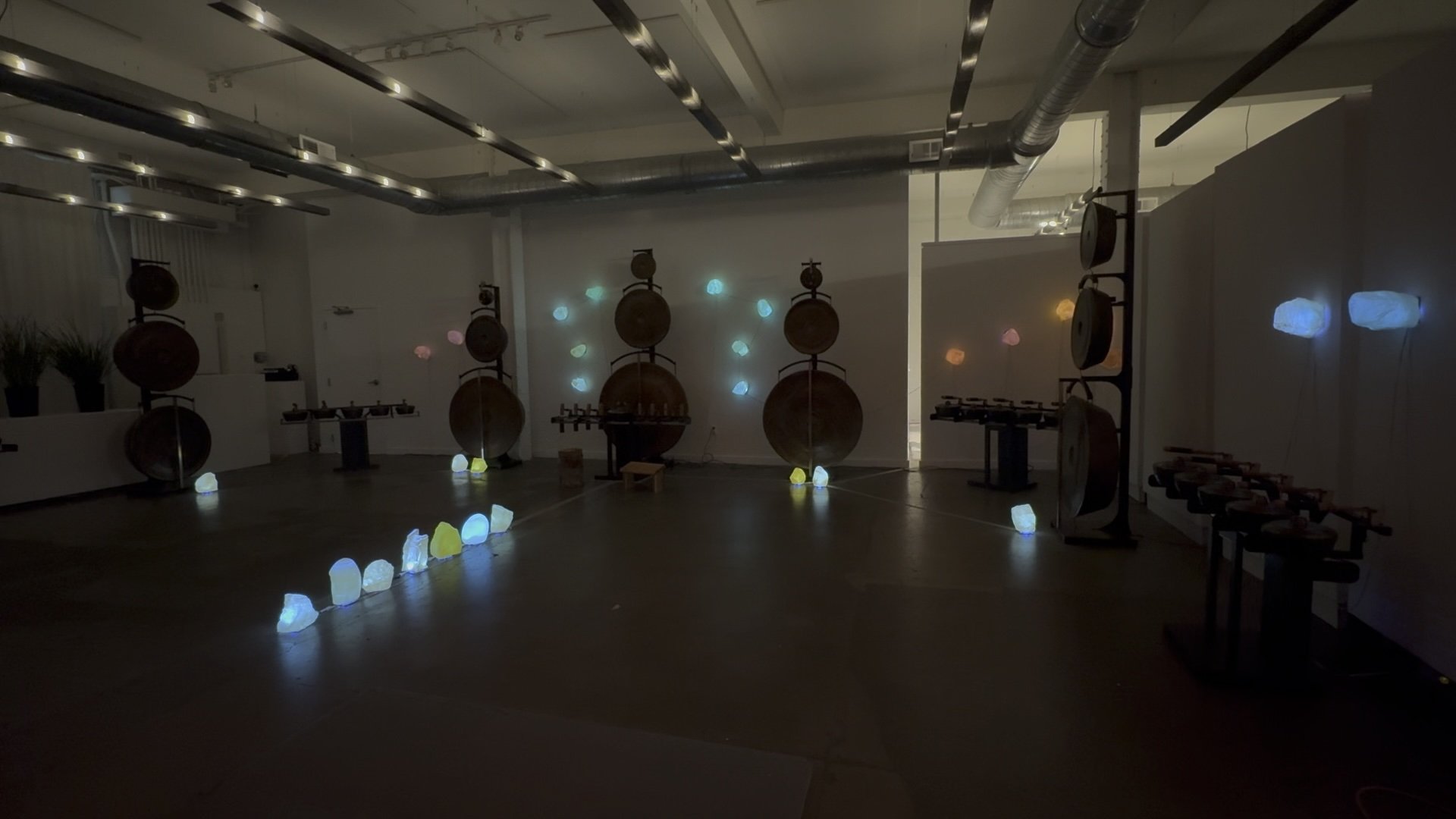 The project took shape as a commission for Gamelatron Sonic Sanctuary: 1000 Ways To Sit, a three-month exhibition at Heron Arts featuring Aaron Taylor Kuffner's immersive sonic kinetic installation. For the sanctuary, each bija was spatially mapped and programmed to respond to different instruments within the gamelan compositions, glowing at varying intensities across the evening. The sculptures became responsive seeds**—**holding geological memory while resonating with sound.