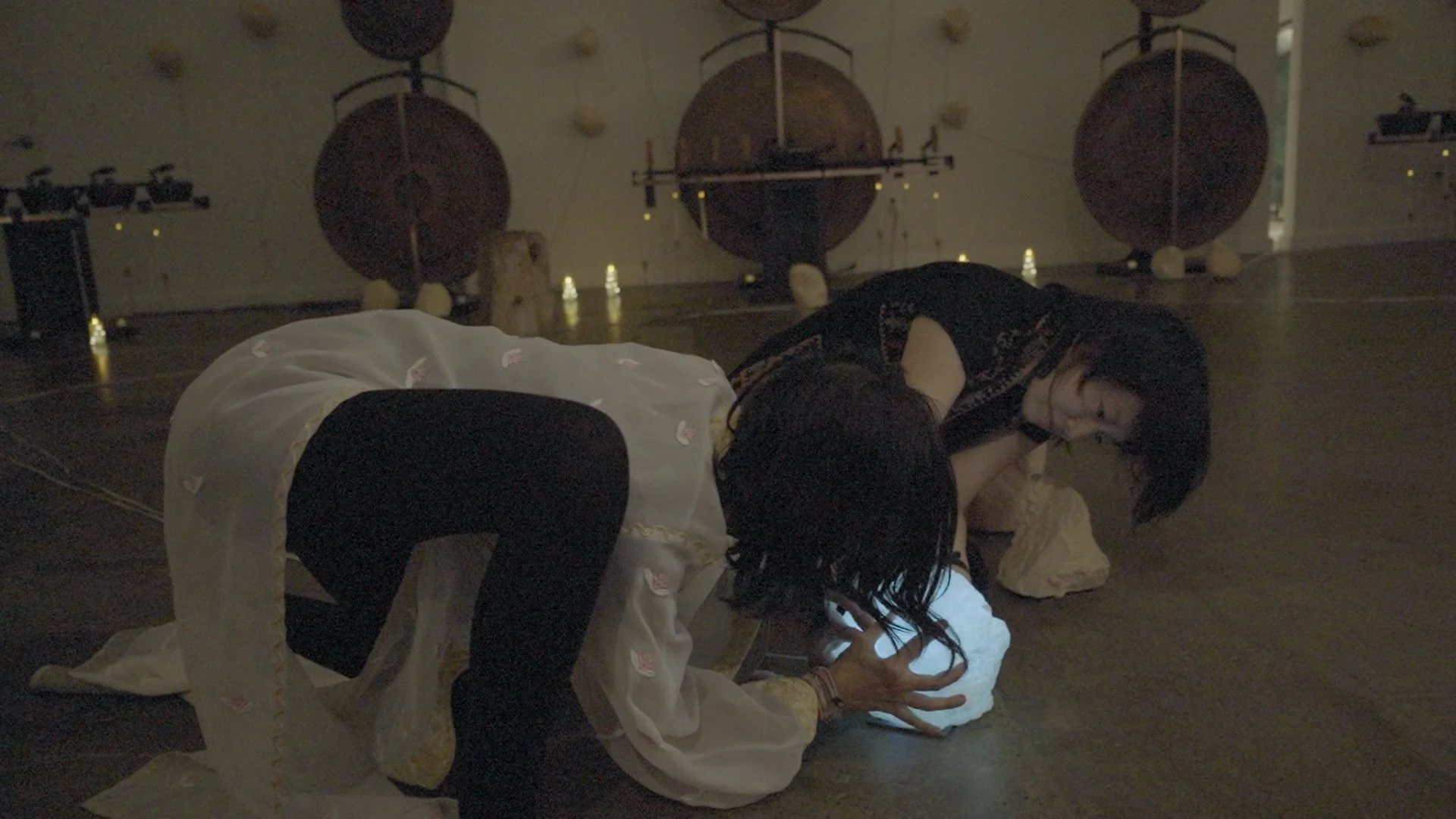 Throughout the exhibition, a rotating group of practitioners, philosophers, and somatic guides, curated by Kamau Akabueze and Sarah Koh, activated the space through public workshops and contemplative gatherings.