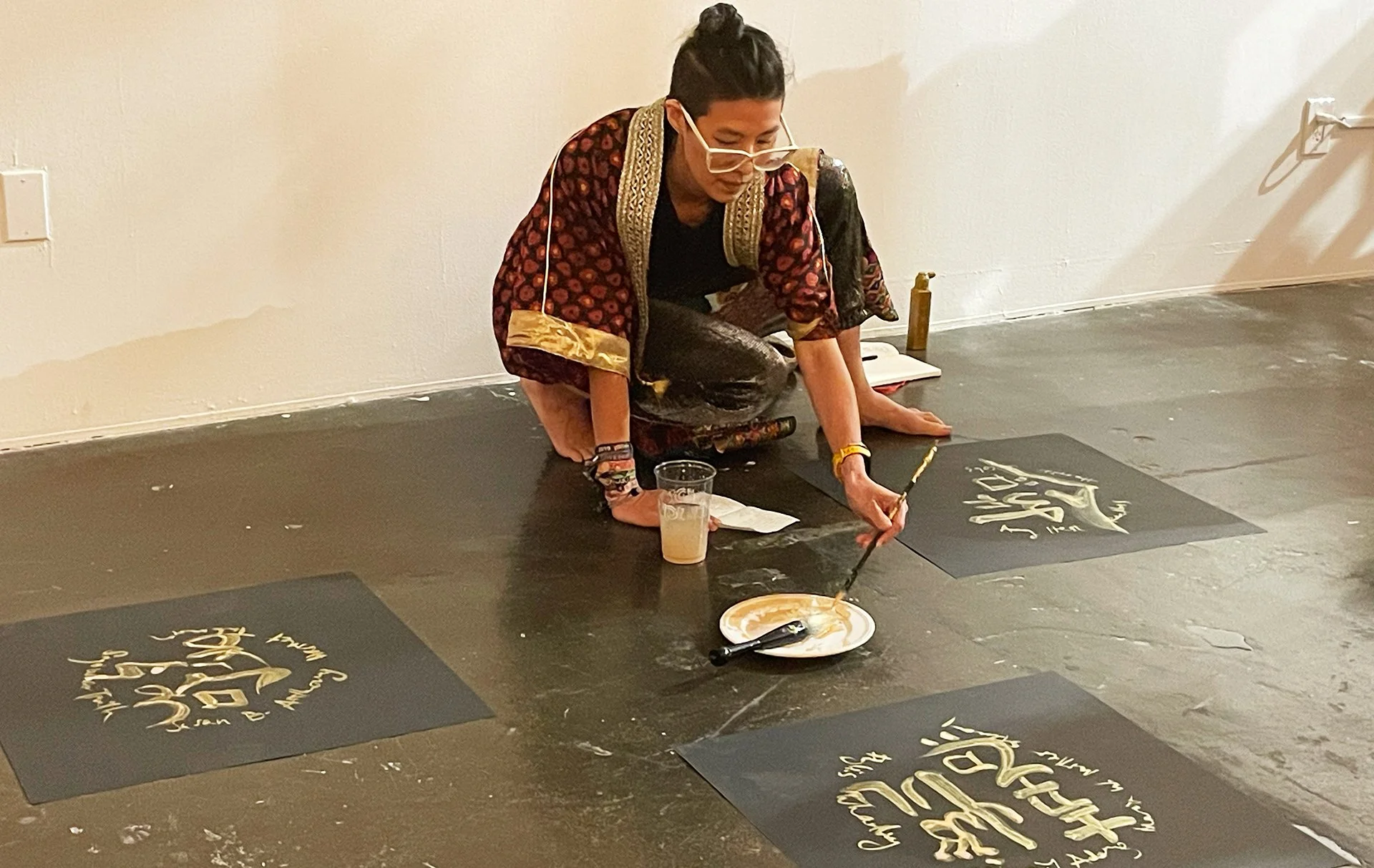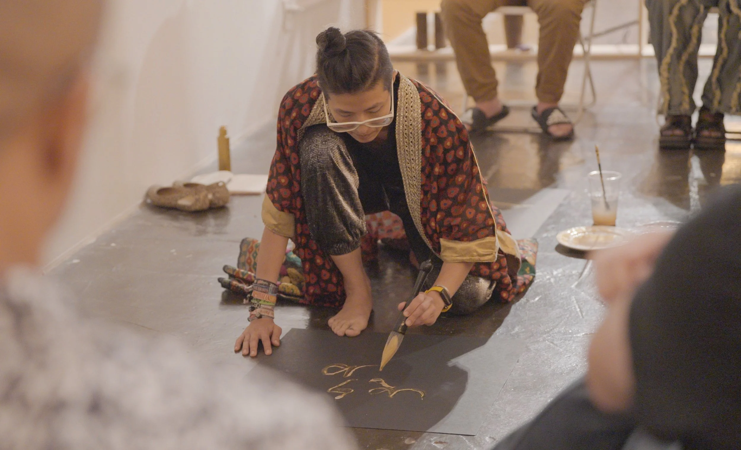A collaborative calligraphy piece created for a Wide Awakes Juneteenth celebration. The artist performed a ritual writing the words "Joy, Life, Enough" by deconstructing and reconstructing Hebrew, Arabic, and Chinese characters into hybrid forms to honor ancestors and connect with liberation movements. The central calligraphy is surrounded by names of female abolitionists researched by the artist and personal ancestors contributed by community participants. Created as part of Helina Metaferia's Meeting Room series, the work explores tensions between honoring ancestral struggle and witnessing contemporary violence, investigating how art can hold multiple truths while advocating for justice across communities.